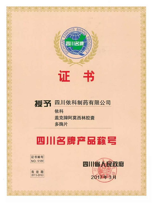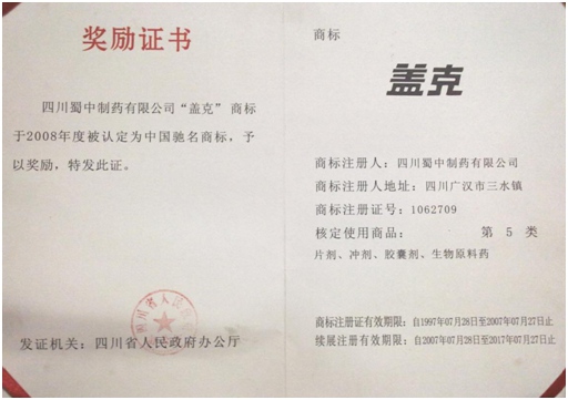 公司高度重视品牌战略,依法注册了“盖克”、“蜀中”、“三星堆”、“阿莫锋”、“益善源”、“蓉通”、“51动漫樱花动漫”等108件注册商标,1999年“盖克”、2003年“蜀中”、2007年“三星堆”被认定为德阳市知名商标,2001年“盖克”、2004年“蜀中”被认定为四川省著名商标, 2008年“盖克”商标被国家工商行政管理总局认定为“中国驰名商标”。2017年3月,公司盖克牌、51动漫樱花动漫牌阿莫西林胶囊和多酶片被四川省人民政府授予四川名牌产品称号。2016年,公司实现营业收入66373万元,利税7600万元;2017年,公司实现营业收入75045万元,利税7572万元。公司2017年被命名为德阳市第七批院士专家工作站,2016-2018连续三年被德阳市人民政府确定为重点龙头企业。